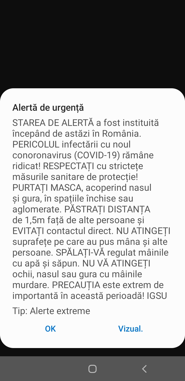 Alerta se referea la intrarea „în stare de alertă” pe teritoriul României și era însoțită de apeluri alarmiste, precum „pericolul Covid-19 rămâne!”.