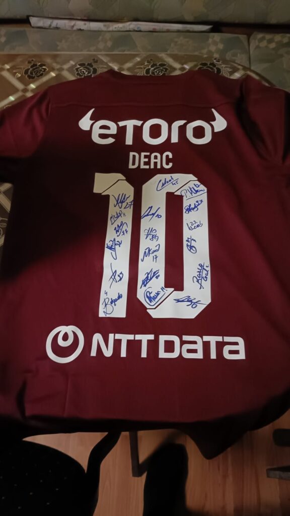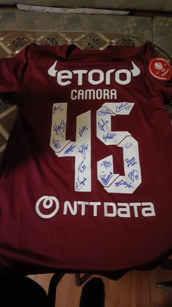 De asemenea, scot la licitație PATRU TRICOURI ALE ECHIPELOR CFR CLUJ (tricourile de joc ale jucătorilor Ciprian Deac si Mario Camora), U CLUJ ȘI FARUL CONSTANȚA (tricoul de joc al lui Ionuț Larie) cu semnăturile tuturor jucătorilor din fiecare echipă !