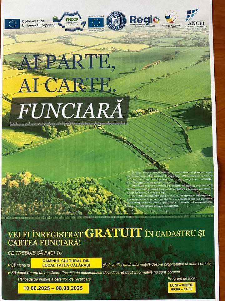 În perioada 10.06.2025-08.08.2025, între orele 09,00 -14,00, la Căminul cultural din satul Călărași, comuna Călărași se pot verifica informațiile privind proprietățile din comuna Călărași care urmează a fi înregistrate GRATUIT în cadastru și cartea funciară.
