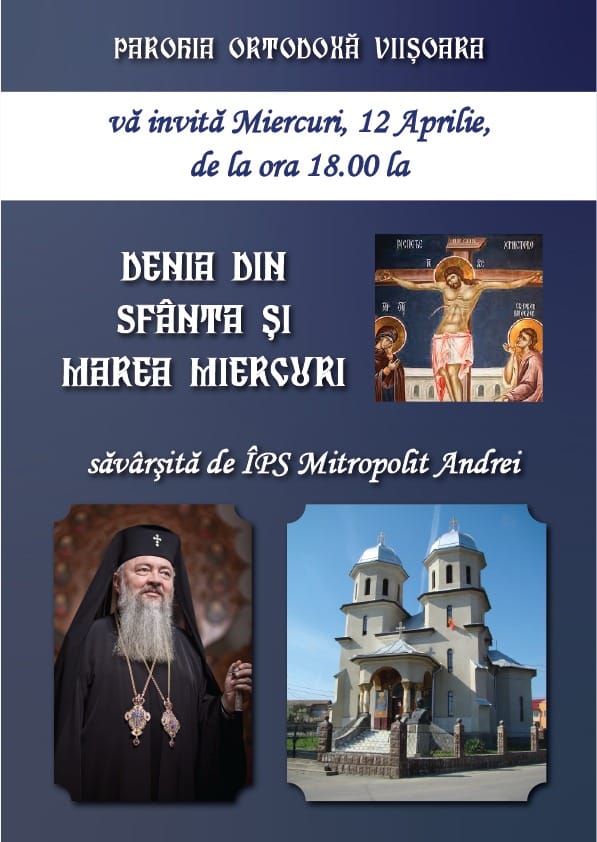 „Dragii mei, intrăm în Săptămâna Pătimirilor Domnului nostru Iisus Hristos și fiecare din noi înmulțim rugăciunea și osteneala duhovnicească. În săptămâna aceasta Înaltpreasfințitul Părinte Arhiepiscop și Mitropolit Andrei va sluji în biserica noastră, Denia din Sfânta și Marea Miercuri, de la ora 18. Vă așteptăm cu drag! Mulțumiri pentru distribuire!”, transmite părintele paroh din Viișoara.