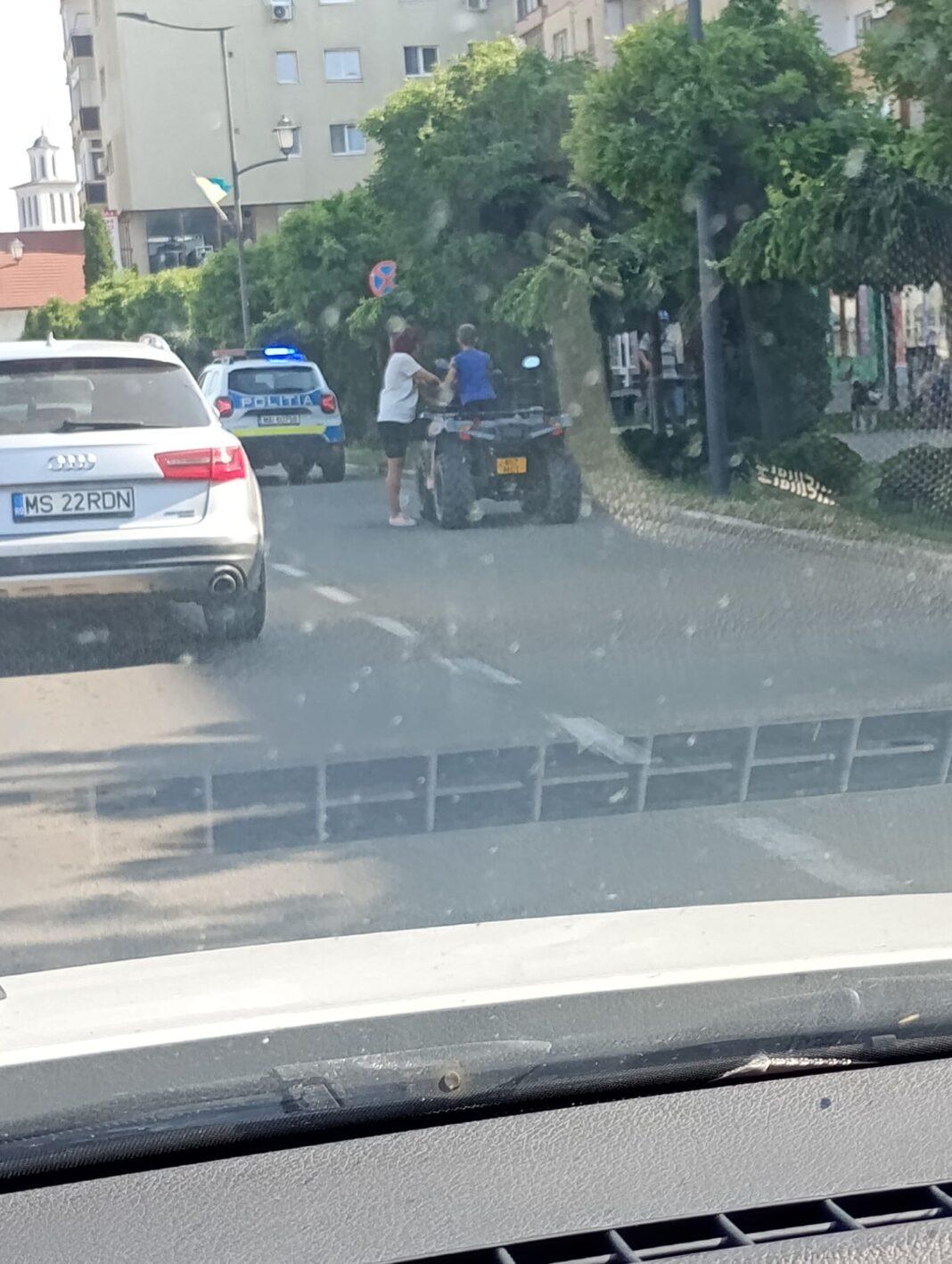 O femeie din Câmpia Turzii a fost surprinsă, în urmă cu puțin timp, pe strada Laminoriștilor, în timp ce-și ducea copilul, pe ATV, fără cască.