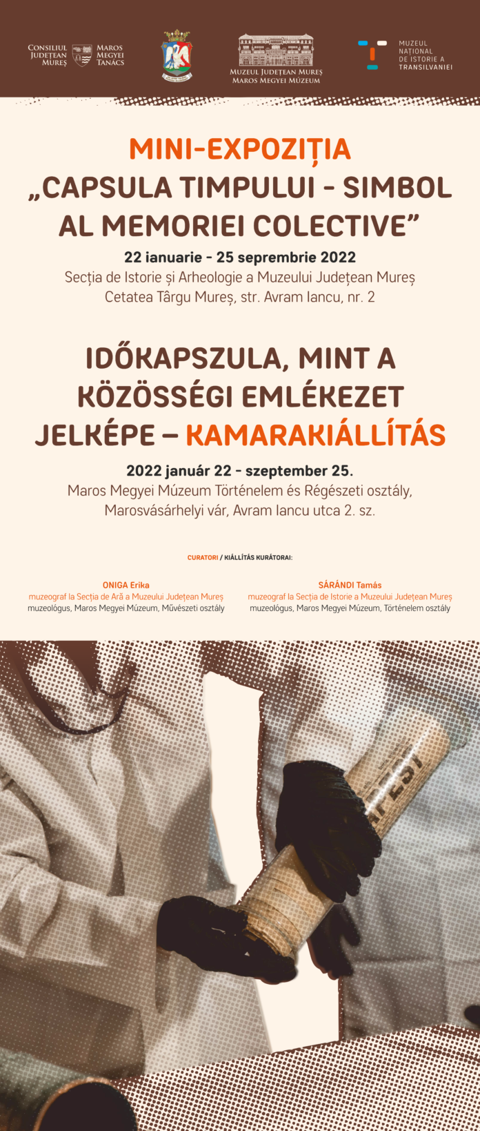 Joi, 17 februarie, de la ora 18:00, la parterul spațiului muzeal din Cetatea Tg Mureș, în cadrul Secției de Arheologie și istorie, va avea loc ghidajul tematic la mini-expoziția temporară CAPSULA TIMPULUI – SIMBOL AL MEMORIEI COLECTIVE. Ghidajul va fi susținut în limba maghiară de către curatorii expoziției – Erika ONIGA, muzeograf la Secția de Ară și Tamás SÁRÁNDI, muzeograf la Secția de Istorie a Muzeului Județean Mureș.
