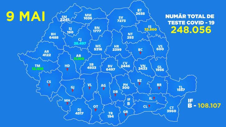 La nivel național, de la debutul pandemiei de Coronavirus și până ieri, 9 mai 2020, au fost realizate 248.056 de testări pentru determinarea Covid-19.