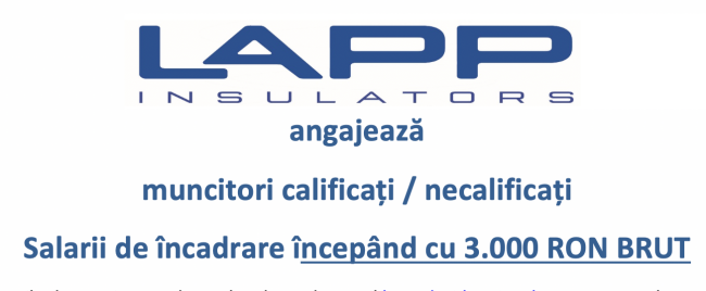 Cererile de angajare se depun la adresa de email hrturda@lappinsulators.com sau la poartă.