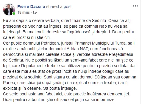 „Eu am depus o cerere verbala, direct înainte de Sedinta. Ceea ce alți președinți de Sedinta au înțeles, se pare ca domnul Nap nu vrea sa înțeleagă. Ba mai mult, dorește sa îngrădească și drepturi. Doar pentru ca e el prost și nu știe citi.