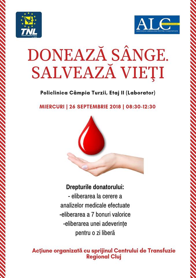 Organizaţia de tineret a Partidului Naţional Liberal Câmpia Turzii împreună cu Asociaţia Liberalism pentru Comunitate organizează o nouă campanie de donare de sânge „Donează sânge. Salvează vieţi”.