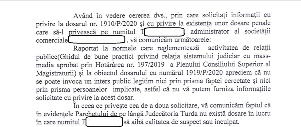 În urmă cu ceva vreme, am solicitat unui parchet din zonă să ne prezinte informații despre un dosar de urmărire penală, precum și să ne spună dacă un anumit om de afaceri din zonă ar avea probleme penale.