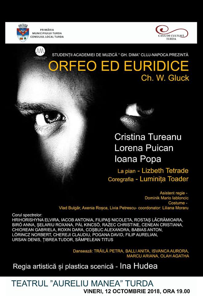 ORFEU SI EURIDICE – operă de Ch. W. Gluck pe un libret de Ranieri de’ Calzabigi, după mitul lui Orfeu și Euridice, în interpretarea tinerilor artiști de la Academia de muzică “Gh. Dima”, a balerinilor de la Liceul de Coregrafie si Arta Dramatica “O. Stroia”, regia, conf. univ. dr. Ina Hudea.