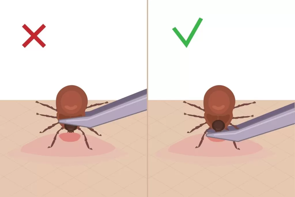 - Prindeți căpușa cu penseta cât mai aproape de piele, ca în imaginea de mai jos, astfel încât să îi puteți extrage și capul. Dacă acesta rămâne în piele, riscul de infectare va fi mai mare, fiindcă saliva poate fi eliberată în organismul gazdei. Nu este o problemă dacă rămân doar cleștii, pentru că vor fi eliminați natural de organism, fără riscuri;