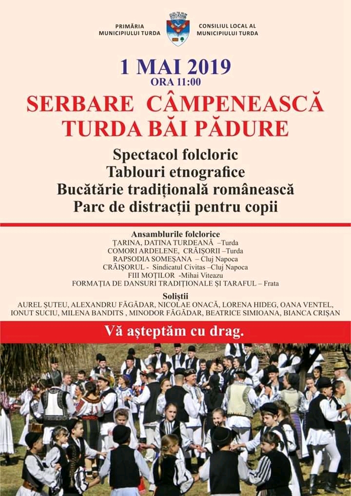 Primăria Municipiului Turda și Casa de Cultură Turda organizează miercuri, 1 mai, o serbare câmpenească. Turdenii care iubesc cântecul, dansul popular şi voia bună sunt invitați în zona Băi Sărate, începând cu ora 11.00, pentru a petrece câteva ore în compania unor solişti îndrăgiți precum: Aurel Șuteu, Alexandru Făgădar, Nicoale Onacă, Lorena Hideg, Oana Vențel, Ionuț Suciu, Milena Bandits, Minodora Făgădar, Beatrice Simioana sau Bianca Crișan.