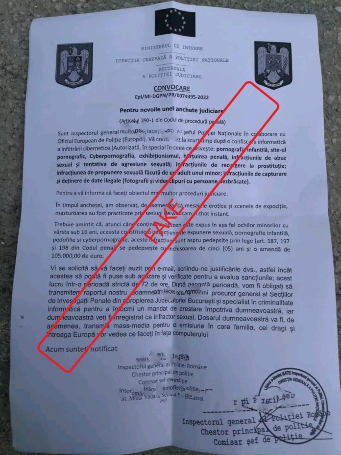 În aceste cazuri, victimele ar fi fost informate că fac obiectul unor presupuse proceduri judiciare ca urmare a accesării unor site-uri, în care sunt prezentate acțiuni cu un caracter sexual explicit, săvârșite de minori.