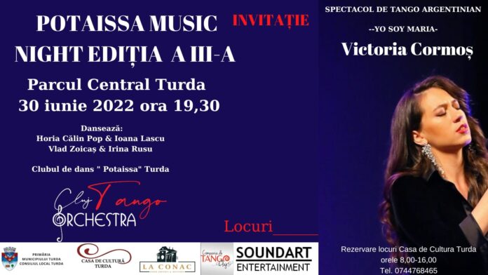 POTAISSA MUSIC NIGHT, ediția a III-a, vă propune anul acesta spectacolul de tango argentinian YO SOY MARIA pe care îl va susține CLUJ TANGO ORCHESTRA, formată din muzicieni profesioniști, membri ai Filarmonicii de Stat Transilvania, ai Operei Naționale din Cluj și ai Colegiului de muzică „Sigismund Toduța”.