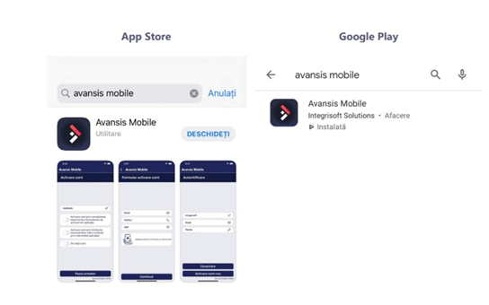 Pentru a instala aplicația, se deschide magazinul de aplicații pe dispozitivul pe care se dorește instalarea și se caută termenul Avansis Mobile.