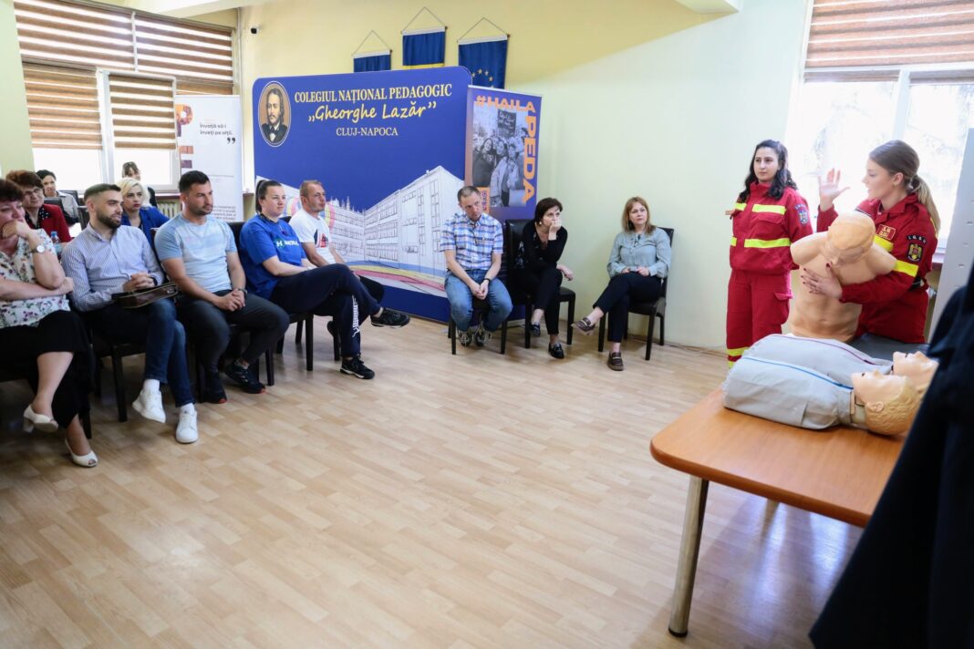 Atelierele de prim-ajutor se desfășoară cu implicarea personalului și voluntarilor ISU Cluj și au fost gândite pentru cadrele didactice, cu scopul de a crește gradul de siguranță în școli.