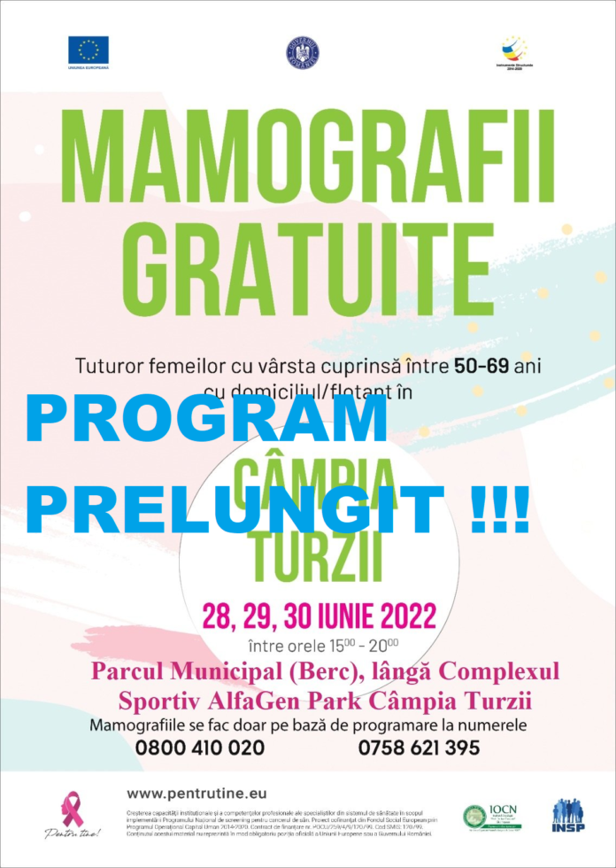 Având în vedere cererea mare din partea doamnelor din Câmpia Turzii, privind activitatea de screening în domeniul cancerului de sân, programul din acest week-end al campaniei va fi prelungit.