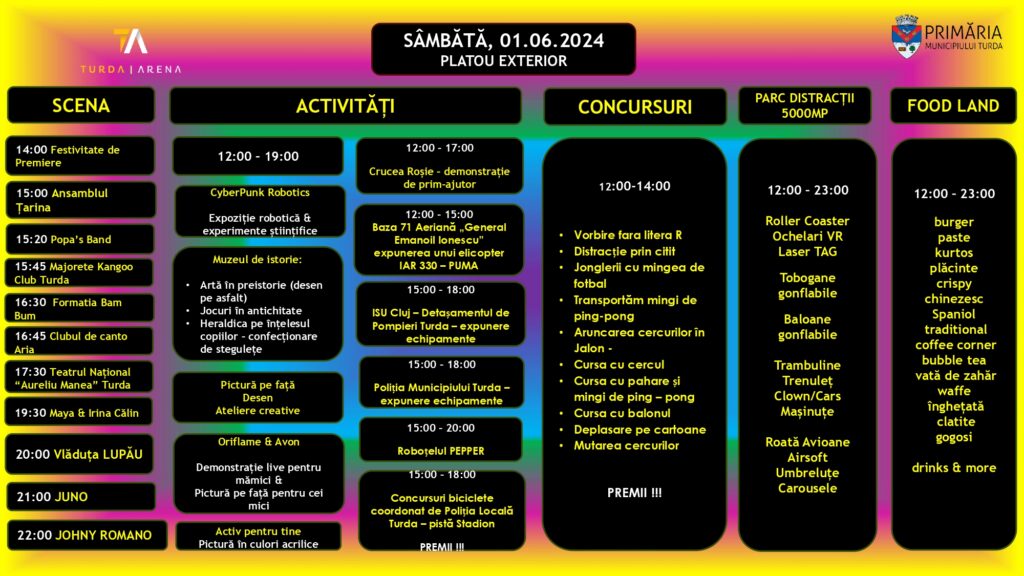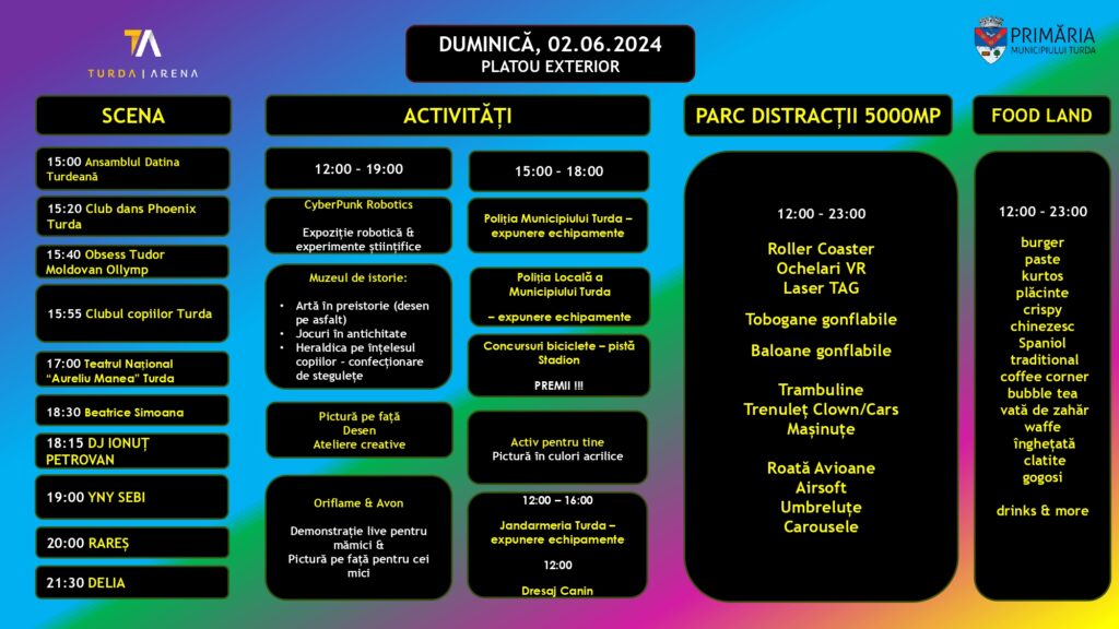 Programul este disponibil, aşadar vă așteptăm cu drag să faceți parte din această experiență de neuitat la sala polivalentă Turda Arena! Marcați în calendar datele de 31 mai – 2 iunie 2024 și haideți să păşim împreună în această călătorie a copilăriei, distracției și a bucuriei!