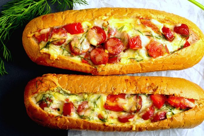2. Scobește miezul din baghete ca să faci loc umpluturii. Pune cârnații, toarnă oul bătut. (Dacă vrei, suplimentar, presară parmezan deasupra)