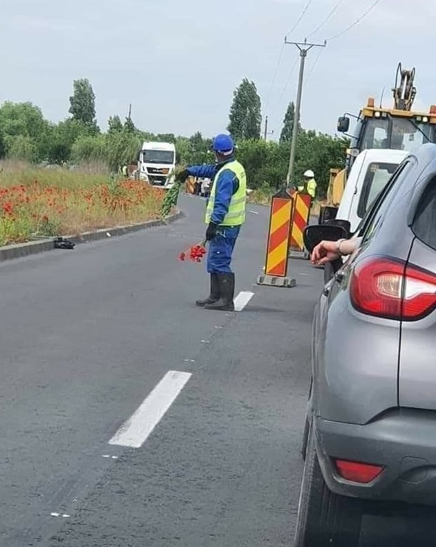 Astfel, deoarece Codul Rutier obligă prestatorii de servicii să dirijeze traficul atunci când execută lucrări care perturbă circulația pe drumurile publice, un „Dorel” oarecare – în lipsă de paletă dublu colorată, cu care să dirijeze traficul … a devenit inventiv.
