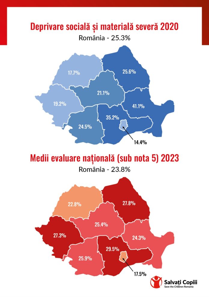 București, 3 iulie 2023: Rezultatele elevilor la Evaluarea Națională reflectă disparitățile și inegalitățile socio-economice dintre regiunile de dezvoltare ale României: astfel, regiunile Nord-Est și Sud-Muntenia, care se regăsesc constant în aproape toate analizele comparative ale Uniunii Europene ca fiind cele mai sărace zone ale Europei (38,2%, respectiv 37,1% – 2022), au cele mai multe medii sub 5 (27,8%, respectiv 29,5) la Evaluarea Națională. De asemenea, regiunea de dezvoltare Sud-Vest Oltenia, afectată în egală măsură de sărăcie (44,7%), înregistrează ponderi modeste ale mediilor peste 5, în vreme ce mediile elevilor din regiunile București-Ilfov și Nord-Vest (sub 5, doar 17,5% și 22,8%), semnificativ mai bune decât în toate celelalte regiuni, coincid cu un nivel al sărăciei și deprivării materiale severe chiar de două ori mai scăzut față de restul țării (17,5% și, respectiv 17,7%). În aceste regiuni, copiii trăiesc în familii cu venituri mai mari și, în plus, beneficiază de o infrastructură școlară adecvată și programe educaționale mai bine structurate, ceea ce poate contribui la performanțe academice mai bune.