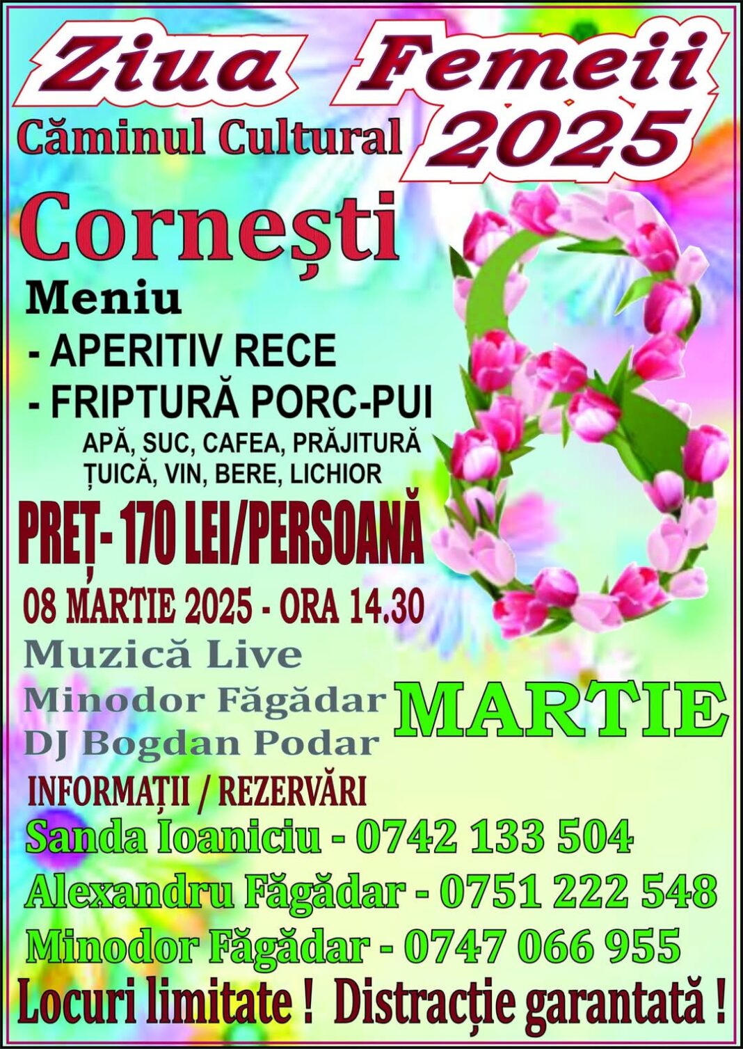 În data de 8 martie 2025, începând cu ora 14:30, Căminul Cultural din Cornești va găzdui un eveniment special dedicat Zilei Femeii, o ocazie perfectă pentru a celebra doamnele și domnișoarele din comunitate.