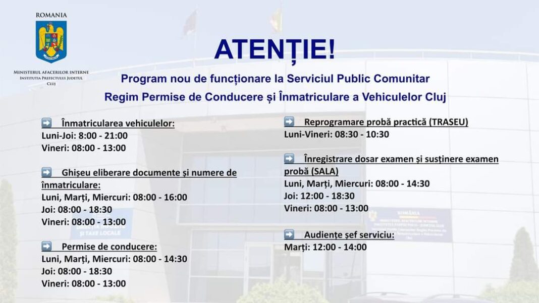 ℹ️ În atenția opiniei publice, Serviciul Public Comunitar Regim Permise de Conducere și Înmatriculare a Vehiculelor Cluj își modifică programul de funcționare, începând de vineri 26 aprilie a.c., după cum urmează: