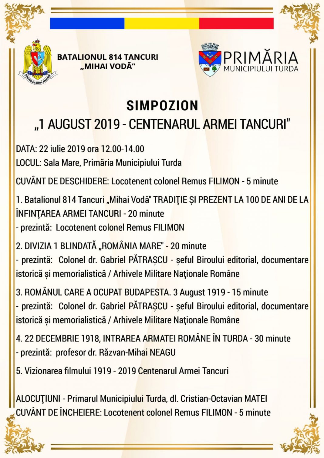 Luni, 22 iulie, cu incepere de la ora 12:00, Primaria Turda gazduieste simpozionul “1 august – Centenarul Armei Tancuri”