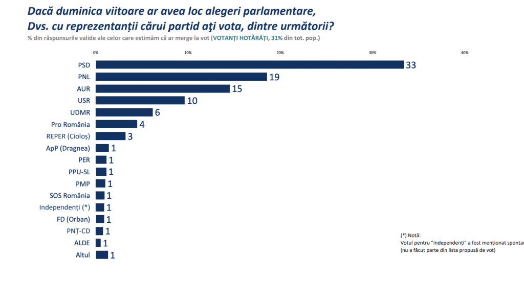 Potrivit sondajului, daca maine ar fi alegeri parlamentare, PSD ar obtine 33% din voturi.