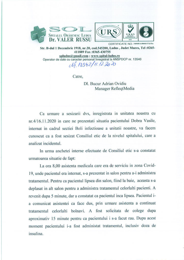 La acel moment, site-ul nostru de știri a solicitat un punct de vedere din partea Spitalului Orășenesc Luduș, la care am primit răspuns acum.