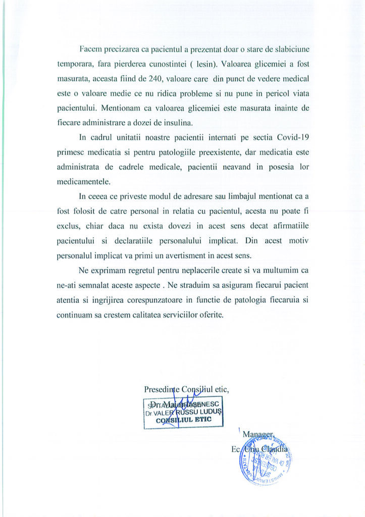 După cum puteți observa din răspunsul Spitalului, viața bărbatului din Hădăreni nu a fost pusă în pericol de creșterea glicemiei, dar cu toate acestea, conducerea unității medicale a dispus sancțiuni împotriva personalului.