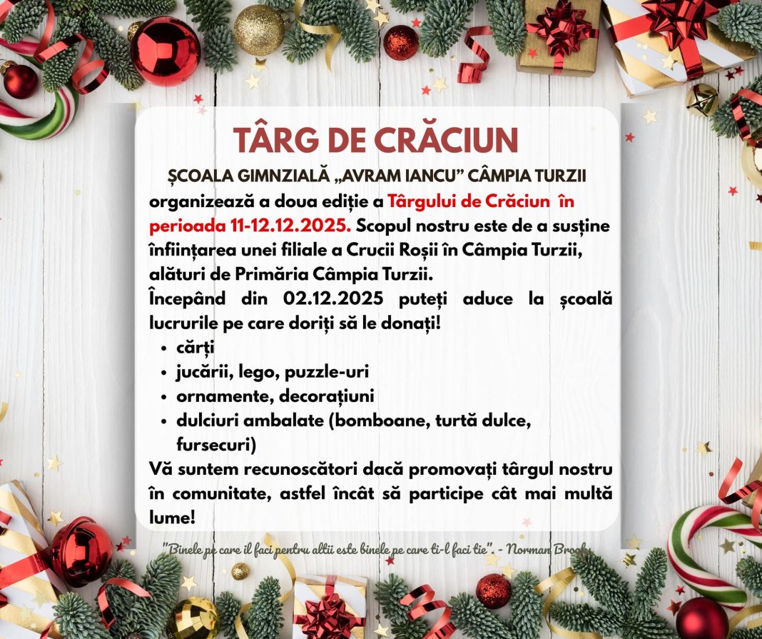 În prag de sărbători, Școala Gimnazială „Avram Iancu” Câmpia Turzii dă startul unuia dintre cele mai frumoase și emoționante evenimente ale iernii: Târgul de Crăciun, aflat anul acesta la cea de-a doua ediție, desfășurat în perioada 11–12 decembrie 2025.