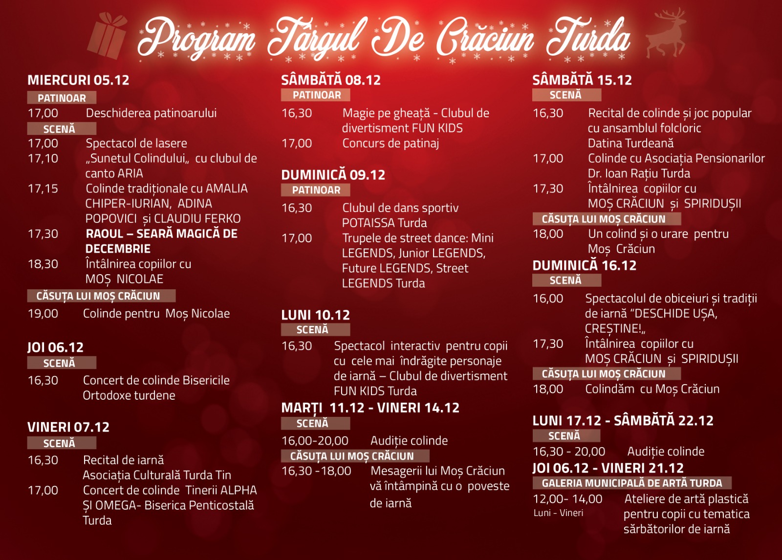 Magia Sărbătorilor va cuprinde și în acest an Parcul Central, oferind tuturor o atmosferă caldă, de poveste. Deschiderea va avea loc în data de 5 decembrie, de la ora 17.00, moment în care se va deschide și patinoarul. Vom da startul evenimentelor cu un spectacol de lasere și colinde, iar invitatul special al serii este îndrăgitul nostru artist turdean, RAOUL, care ne va încânta cu o Seară Magică de Decembrie!