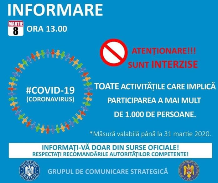 ?Începând de astăzi, 8 martie 2020, sunt interzise manifestările publice sau private, în spații deschise sau închise, cu un număr de participanți mai mare de 1000 de persoane.