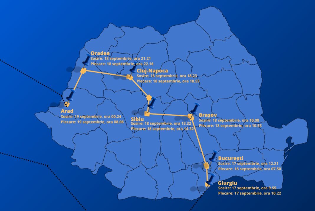 „Astăzi #ConnectingEuropeExpress ajunge în România. Va sosi în București la Gara de Nord la ora 12:21 urmând ca mâine dimineață să plece spre Curtici via Brașov-Sibiu-Cluj-Arad. Tracțiunea va fi realizată pe întreg teritoriul țării de către #CFRCălători. #connectingeurope #EUYearofRail”, transmite Ministerul Transporturilor.
