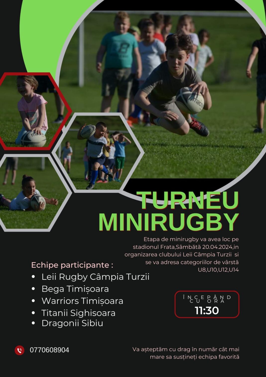 Sâmbătă, 20 aprilie, de la orele 11:30, terenul sportiv din Frata va fi gazda unui turneu de minirugby, organizat de Leii Câmpia Turzii.