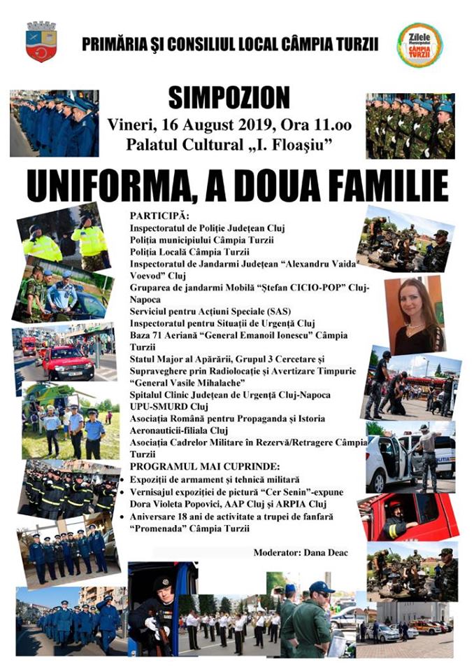 Simpozionul „Uniforma, a doua familie” va avea loc vineri, 16 august, ora 11:00, în Sala de Ședințe a Palatului Cultural „Ionel Floașiu” din Câmpia Turzii și reprezintă unul dintre cele mai sincere și pline de gratitudine gesturi de omagiere pe care un oraș le poate face față de eroii săi.