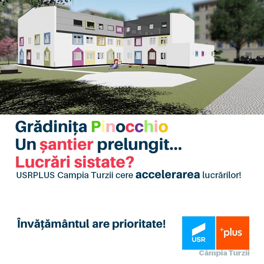 Realizat cu bani din PNDL 2, Proiectul de etajare a Grădiniței Pinocchio de pe strada Retezatului din Câmpia Turzii s-a lovit de probleme încă de la început. După mai multe licitații ratate, lucrările au început, însă USR PLUS consideră că aceste lucrări se fac prea încet.