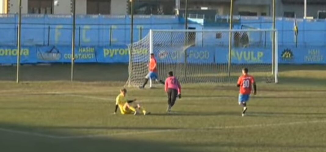 La o faza de atac a formatiei din Campia Turzii, atacantul Denis Baciu a fost accidentat GROAZNIC de portarul formatiei din Grindeni, care a iesit ca pe aratura.