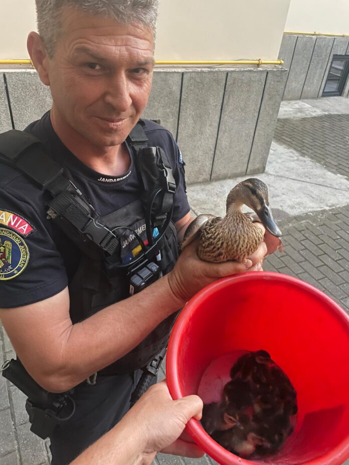 Jandarmul a solicitat de îndată dispeceratului unităţii trimiterea unui echipaj pentru a ajuta familia de rațe să revină în siguranță la lacul din Parcul Central.