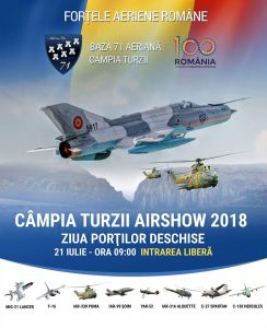 Sâmbătă, 21 iulie, cu începere de la ora 9:00, va fi organizată Ziua Porților Deschise la Baza 71 Aeriană Câmpia Turzii.