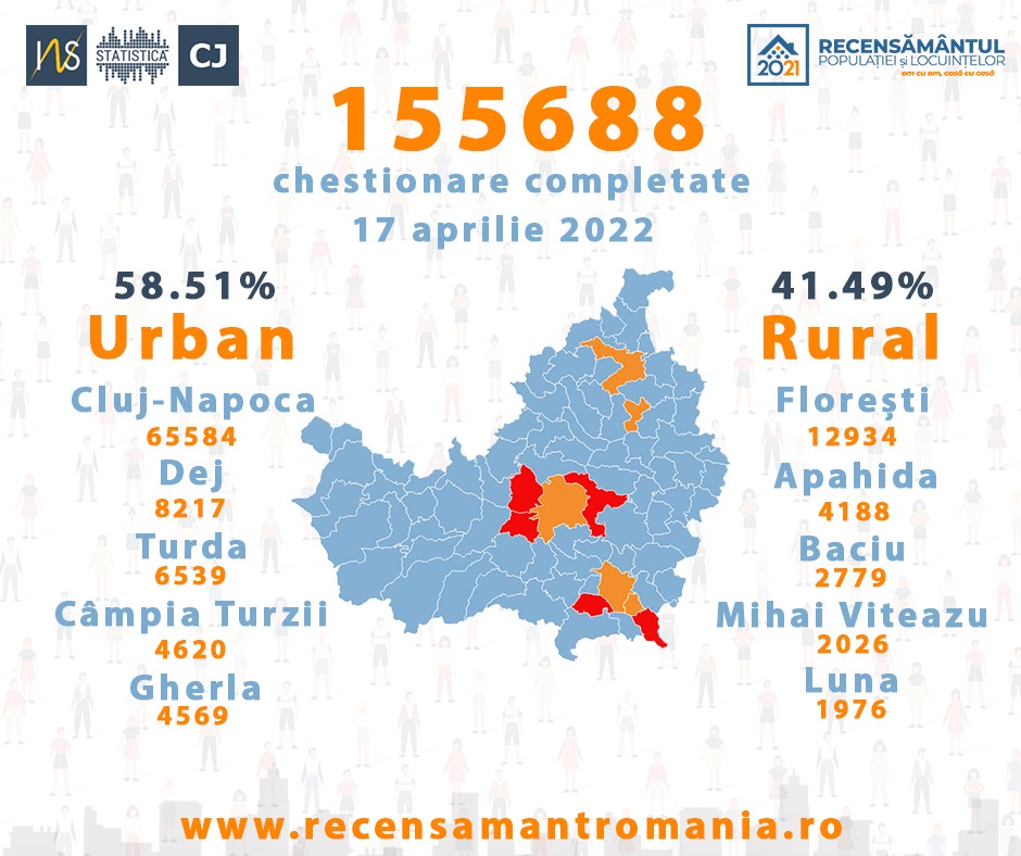 municipiul Gherla cu 4.569 chestionare, și orașul Huedin cu 1.564 chestionare completate.